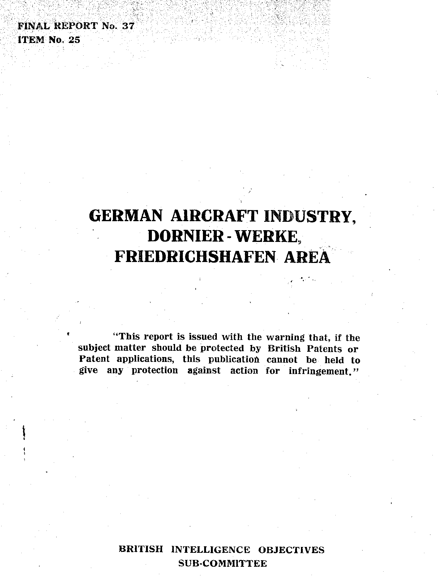 Keywords: The team left England on 17th July 1945 and returned on the 28th July, 1945; Dr. Schneider - Herr Oesterle - Herr Flittiger - Herr Herzog - Dr. Wieland - Herr Geisberger - Herr Hofmann; The German Air Ministry did not discuss with the firm the output required, they were ordered to produce either aircraft of their own or other firms'design to a programme set at Air Ministry Headquarters.... ; Proi to the bombing early 1944 the firm occupied some 11 factories and were almost self-contained for the production of airframes; normal hours worked were 69 to 72 hours per week. In general the factories only worked day shifts. Night shift was used to clear bottlenecks or on receipt of material after a shortage ... ; The main factory at Manzell had extremely well laid-out shelters under most of the factory ... ; Underground factory the construction of a factory was commenced early in 1944 ... ; The total floor planned 47,000 sq.yds (about 40,000 m2 .. and they planned to employ in their portion of the factory some 9,000 workers on a 3-shift basis .. ; The Dornier Do 335 ...; January design commenced .... ; The dispersed sites were well chosen ..