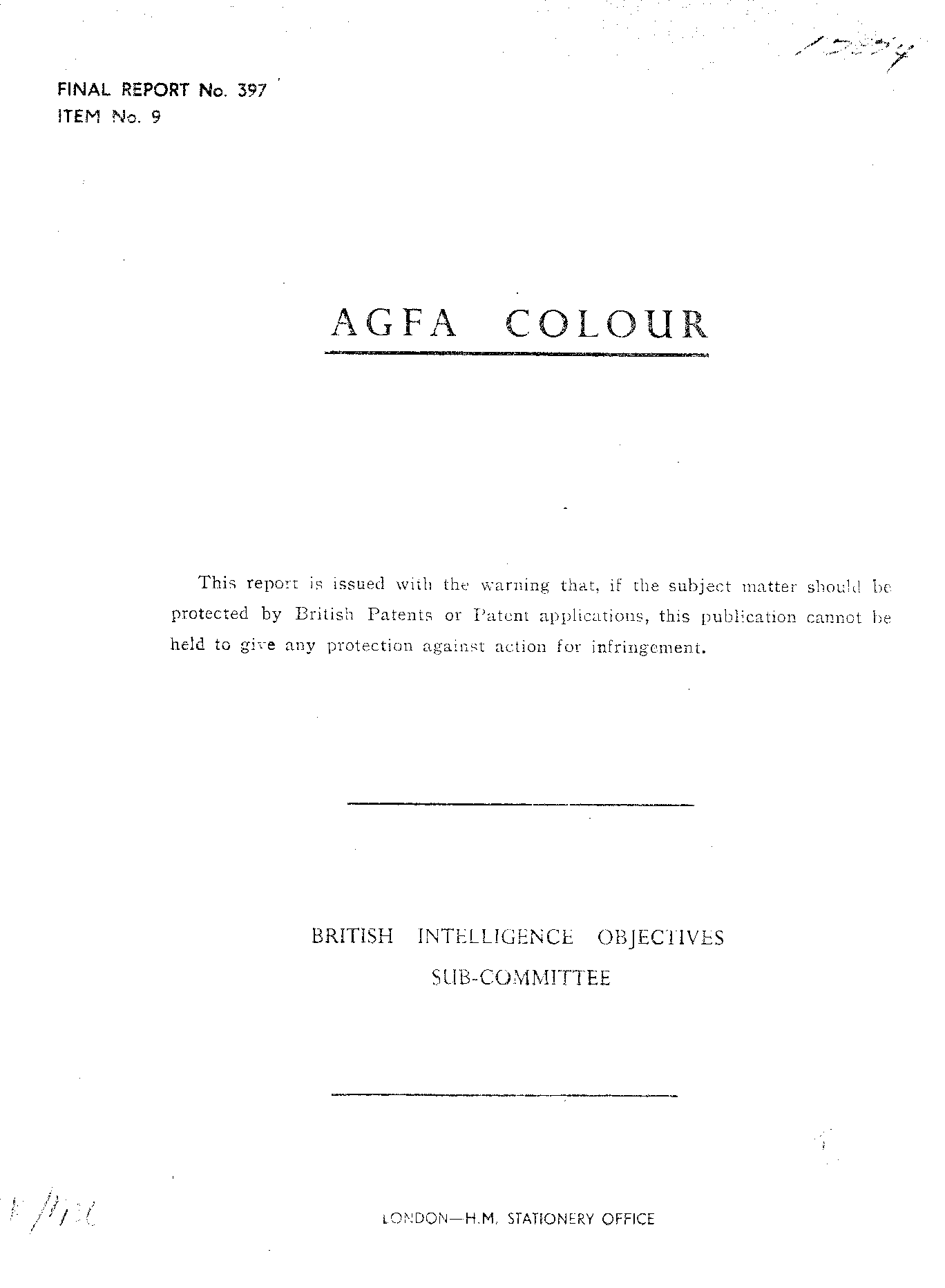 Keywords: AGFA Colour Negative Positive Process; Technical information on the processing of AGFA Colour Negative and Positive; Film Production in the British Zone of Germany; Film production - Dubbing facilities in the British Zone, Conversation with Bruno Jensens ex-chief sound engineer U.F.A. studios; Agfa Colour negative - paper process; This process has been developed by the AGFA technicians during the war; Very obviously, however, such lightning as exists in British Studios to-day would be perfectly adequate for the purpose of photographing in Agfa colour; The printing out of a film can be carried out on any normal Printer that particularly makes use of a moving diaphragm; The Patents of Agfa Colour being public domain and available to any who care to use them ... ; Formula of viscous bleach .. ; The Mars Laboratory is part of the UFA Organisation ...