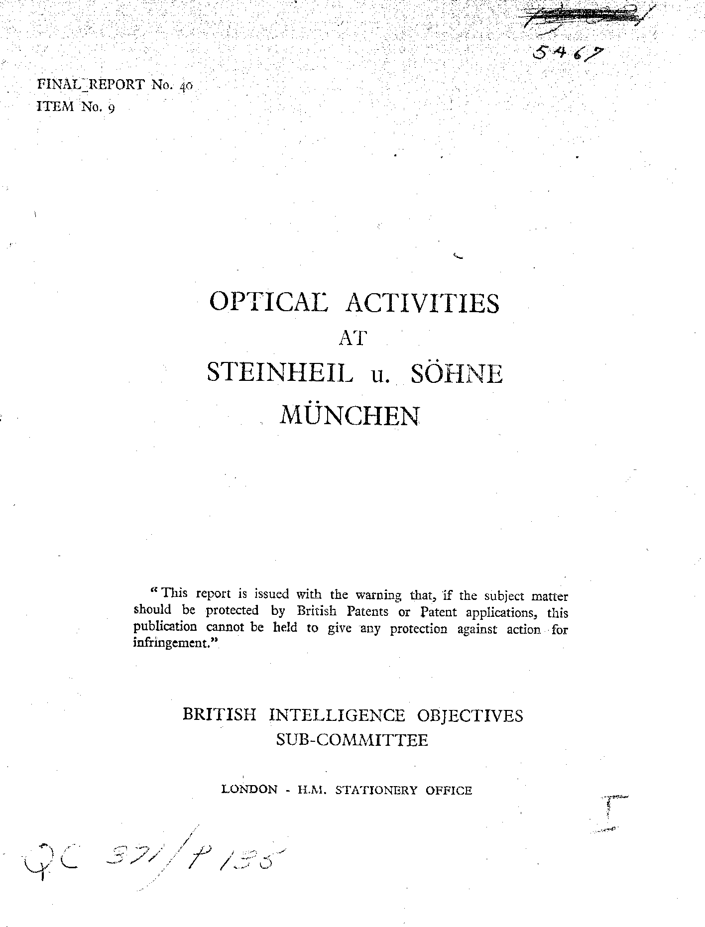 Keywords: Object of visit, low reflecting films & semi-reflecting mirrors, Synthetic crystals, camera manufacture, photographic lens manufacture, Aircraft optical instrumenst; This target had previously eebn visited by photographic experts but was recommended that an optical specialist should also visit the firm ... ; Herr Schacht Director of the firm ... Dr. Rollwagen Chief Physicist .. Herr Ulrich from the sales staff .. Herr Bender Optical Inspector .. ; The firm had conducted a good deal of research during the war on coating of optical surfaces .. ; synthetic crystals of NaCl, KBr and LiF ... ; Steinheil had manufactured synthetic crystal of Potassium Bromide, Lithuim (Lithium Fluoride and Sodium Chloride) using a method developed by Pohl of Göttingen .. ; At the time of visit French Bronzavia aircraft cameras were in course of production to an order of Col. Goddard of the U.S.A.A.F.; A novel method was employed by the firm for focussing cameras, based on the described by Günther Korff of Göttingen .. ; Steinheil had made the wellknown Lotfe 7K bombsight to the Zeiss design. They had also designed a divebombsight termed the BZA20 at the same time as the TSA20 was designed by Zeiss ... Periscopic Gunsights ... RF2C and RF2B and OG19A .. PV1B .. ; since American Army authotities are in close touch with the firm and because of the conclusions it is recommended that no further investigation need to be made.