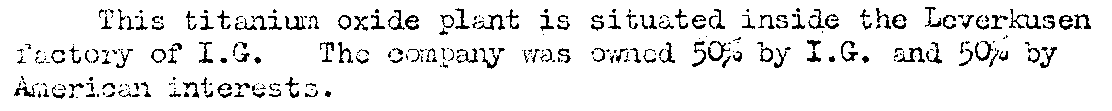 This titanium oxide plant is situated inside the Leverkusen factory of I.G.(Farbenindustrie, AOB). The company was owned 50% by I.G. and 50% by American interests.