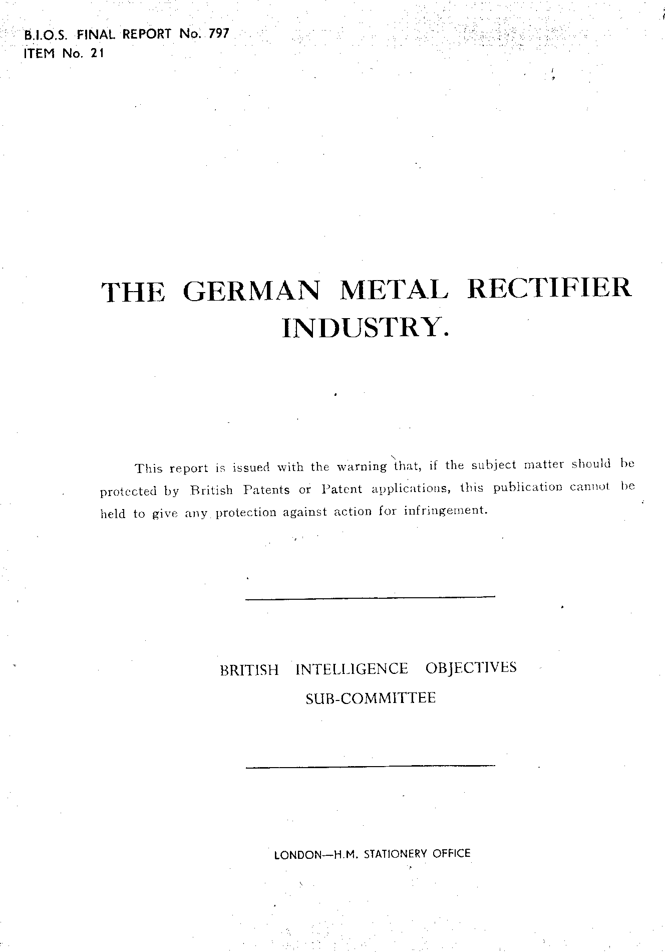 Keywords: Composition of the Industry; Uses of Rectifiers; Selenium Rectifiers, Processes of Manufacture; Süddeutsche Apparate-Fabrik (S.A.F., AOB) C21/1543; Mix & Genest C21/1544; Siemens-Schuckert-Werke 21/23 (SSW, AOB); AEG C21/1363; Selenium Supply; Manufacture of Seleneous Acid; Precipitation of Selenium from Selenium Dioxide; Theoretical Conclusions concerning Selenium Rectifiers; Relative Merits of Various Manufacture methods; The Phiysical basis of the Selenium Rectifier; The Counter-Eelectrode; Electrical forming; Ageing; Alternative types of metal rectifier, proposals for future research; Copper-oxide rectifiers, process of manufacture; TeKaDe A.G.; S.A.F produced annually 36,000,000 selenium rectifiers; S.S.W. (SSW) 6,000,000 samples; AEG 10,000,000 units; TeKaDe 200,000 pieces; Gleichrichter Ring (Rectifier Ring); SAF Herr Hermann - Dr. Kippham - Dr. Lauckner; Hand-coating process; pressed powder process; Mix & Genest Dr. Kauffmann - Dr. Mehliss; SSW Herr Tschermak - Dr. Nietsche; AEG essential difference between .. evaporated .. ; Supply of selenium by Bolidens Sweden .. ; SAF added iodine - AEG bromide ... ; Japanese selenium ... ; manufacture of seleneous acid; Nitric Acid; precipitatation of selenium dioxid for SAF .. ; Prague conferenz 24-25 November 1945 Gleichrichter Ring ... ; The electrical conductivity of selenium; building up of the barrier-layer .. ; counter-electrode .. ; Koch and Paganski investigations and conclusions .. ; Owing to the difficulties in obtaining supplies of raw material in the later stage of the war .. ; Dr. H. Schmidt - Dr. Koch and Poganski - Dr. van Dingenen - Dr. Lehovec - Dr. Krebs together with AEG - SAF Dr. Baum - Dr. Muschweck .. ; German copper versus American Copper .. Felten & Guilleame Carlswerk A.G. Köln-Mühlheim and Wieland-Werke Ulm electrolytic copper .. ; sirutoren sirutor .. ; SSW Herr Tschermak Dr. Nietsche; Sirutor Siemens H.F. detector .. ; For the manufacture of HOKO (Highly stable discs a pre-ageing treatment of 48 hours at 90° C was applied .. ; Dr. Waibel (Siemens). American C.C.C.