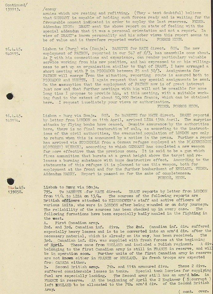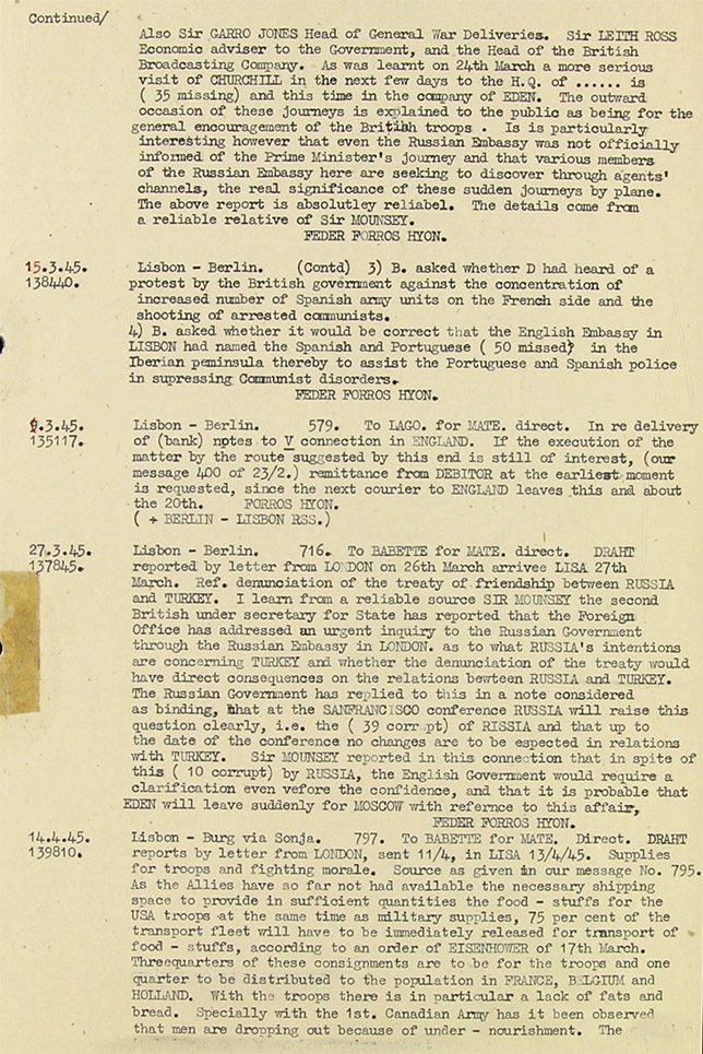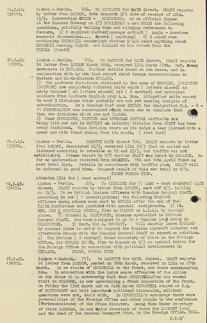 16.3.45 (Isk 136057) Lisbon - Berlin. 635 To (Babette)-Sibelius for (? Lago (= Oblt von Carnap) Mate (= Obstlt. Friedrich von Bohlen KV 2/1975) direct. Draht (Zigzag) reports by letter from London, sent off 9/3 in Lisa (Lisbon) on 13/3. In re British Liaison Officers with Russian general Staff. According to own (? investigations the following English officers among others were sent to Russia after the end of the Yalta Conference (Stalin Roosevelt and Churchill attended) and provided with special assignments. 1) Lt.General Sir H Colville Wemyss, flew to Moscow on 4.3.45 by special plane. 2) Colonel E. Hackforth, Russian specialist in British General Staff. Has been assigned to go to a Russian Army Group in Bialystock. 3) Capt. Sir? L. Browset. Will shortly leave England by special plane in order to inspect the Russian aircraft industry and afterwards remain with the Russian general Staff as expert on aviation. 4) The British (5 corrupt) Under Secretary of State in the Foreign Office, Sir Howard Smith, flew to Moscow on 8/3 on special duties for the Foreign Office in connection with political developments in Finland, Feder (Hans Brandes) Forros = Hyon (= Obst. Federici, Leiter KO Portugal)