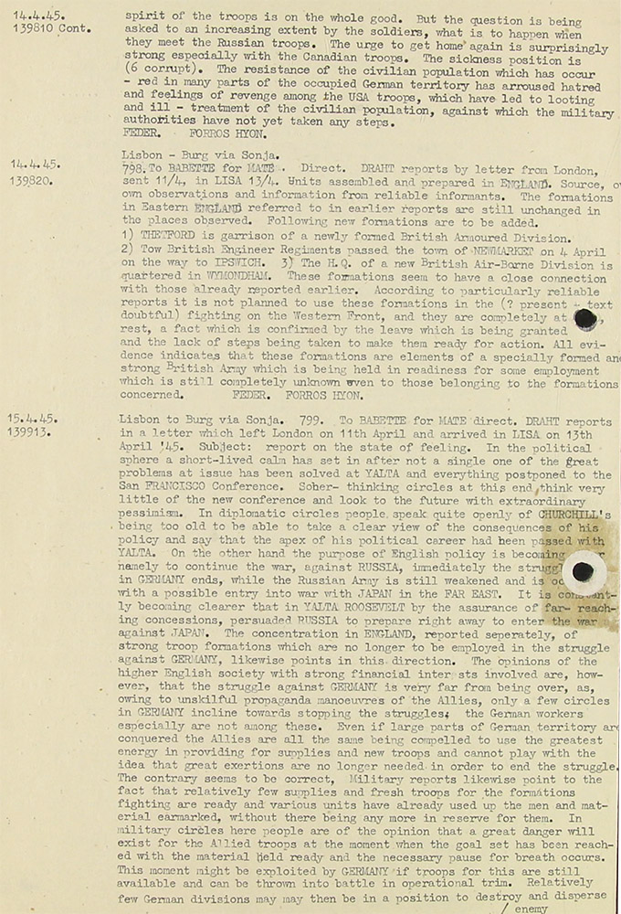 15.4.45 (Isk 139913) Lisbon - Burg (Berlin) via Sonja (Stuttgart). 799. To Babette for Mate (= Obstlt. Friedrich von Bohlen KV 2/1975) direct. Draht (Zigzag) reports in a letter which left London (by airmail) on 11 April and arrived in Lisa on 13th April '45. Subject: report of the state of feeling. In the political sphere a short-lived calm has set in after not a single one of the great problems at issue has been solved at Yalta and everything postponed to the San Francisco Conference (the forerunner of the United Nations). So her- thinking circles at this end think very little of the new conference and look to the future with extraordinary pessimism. In diplomatic circles people speak quite openly of Churchill's being too old to be able to take a clear view of the consequences of his policy and say that the apex of his political career had been passed with Yalta. (AOB: here it became evident that Britain soon would no longer belong to the leading powers in the world!) On the other hand the purpose of English policy is becoming ?? namely to continue the war, against Russia, immediately the struggle ?? in Germany ends, while the Russian Army is still weakened and is ? with possible entry into war with Japan in the far east. It is ? becoming that in Yalta Roosevelt by the assurance of far-reaching concessions, persuaded Russia to prepare right away to enter the war against Japan. The concentration in England, reported separately, of strong troop formations which are no longer be employed in the struggle against Germany is very far from being over, as, owing to unskilful propaganda manoeuvres of the Allies, only a few circles in Germany incline towards stopping the struggles; the German territory are conquered the Allies are all the same being compelled to use the greatest energy in providing for supplies and new troops and cannot play with the idea that great exertions are no longer needed in order to end the struggle. The contrary seems to be correct, Military reports likewise point to the fact that relatively few supplies and fresh troops for the formations fighting are ready and various units have already used up the men and material earmarked, without there being and more reserve for them. In military circles here people are are of the opinion that a great danger will exist for the Allied troops at the moment when the goal set has been reached with the material held ready and the necessary pause for breath occurs. (AOB: please continue to read the remaining content yourself as, in my perception, its content isn't really relevant)