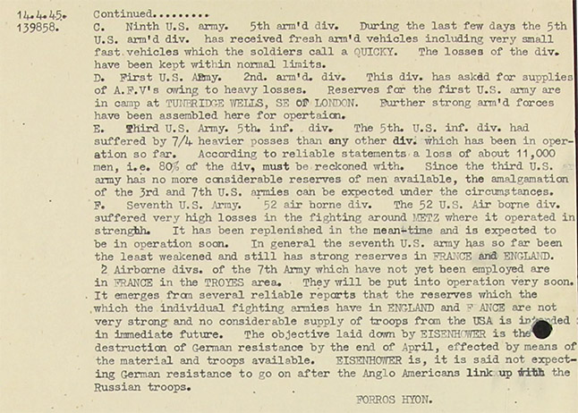14.5.45 (Isk 139820) Lisbon - Burg (= Berlin) via Sonja (= Stuttgart). 798. To Babette for Mate (= Obstlt. Friedrich von Bohlen KV 2/1975) Direct. Draht (Zigzag, Edward Chapman) reports by letter from London, sent 11/4, Lisa (Lisbon) 13/4. Units assembled and prepared in England. Source, own observations and information from reliable informants. The formations in Eastern England referred to the earlier reports are still unchanged in the places observed. Following new formations are to be added. 1) Thetford is garrison of a newly formed British Armoured Division. 2) Two British Engineer regiments passed the town of Newmarket on 4 April on the way to Ipswich. 3) The H.Q. of a new British Air-Borne Division is quartered in Wymondham. These formations seem to have a close connection with those already reported earlier. According to particularly reliable reports it is not planed to use these formations in the ("present text doubtful) fighting on the Western Front, and they are completely at ? rest, a fact which is confirmed by the leave which is being granted and the lack of steps being taken to make them ready for action. All evidence indicates that these formations are elements of a specially formed and strong British Army which is being held in readiness for some employment which still completely unknown even to those belonging to the formation concerned. Feder (Hans Brandes) Forros = Hyon (= Obst. Federici Leiter KO Portugal) (AOB, notice: that the Russian have reached the outskirts of Berlin already!)