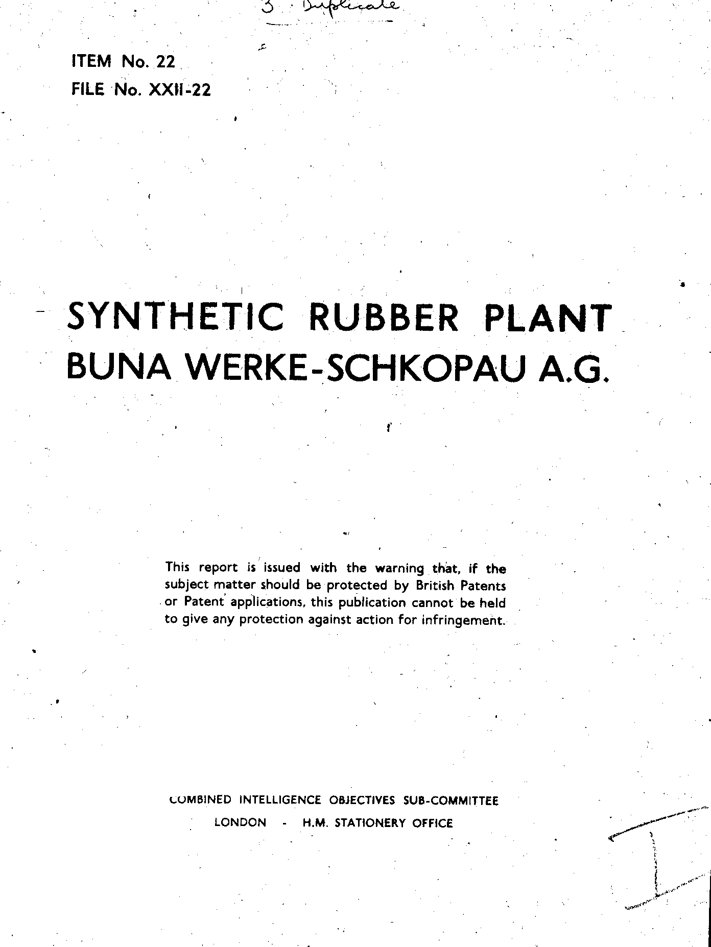 Keywords: Buna Werle, Schkopau, is the largest Buna S synthetic rubber plant in Germany with a rated capacity of 6,000 tons per month. Production in 1943 wa 68,000 tons, and several months was slightly in excess ...
