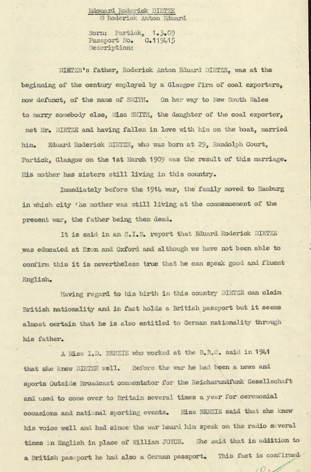 A Miss I.D. Benzie who worked at the B.B.C. said in 1941 that she knew Dietze well. Before the war he had been a news and sports Outside Broadcast commentator for the Reichsrundfunk Gesellschaft and used to come over to Britain several times a year for ceremonial occasions and national sporting events. Miss Benzie said that she knew his voice well and had since the war heard him speak on the radio several times in English in place of William Joyce (= Lord Haw-Haw). She said that in addition to a British passport he also had a German passport. This fact is confirmed →