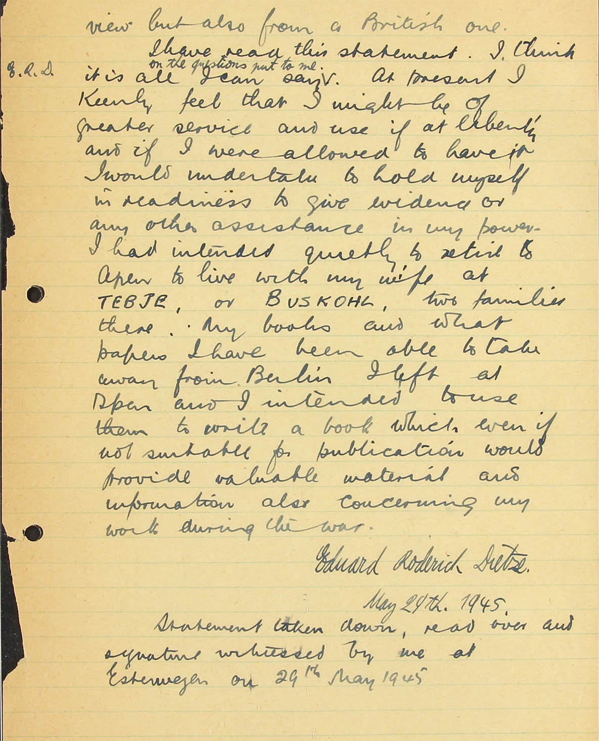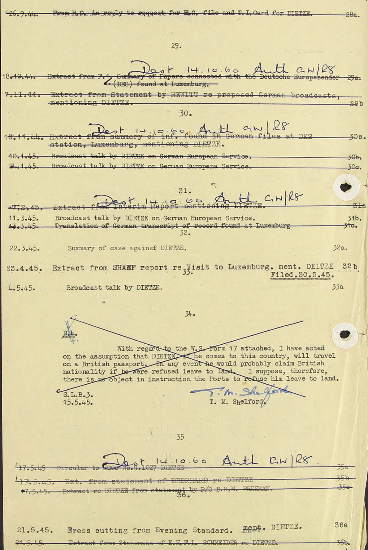 S.B.L.3 (AOB: this branch has something to do with criminal prosecution; whether valid in Dietze's case remains open) 15.5.45 Sgd. T.M. Shelford