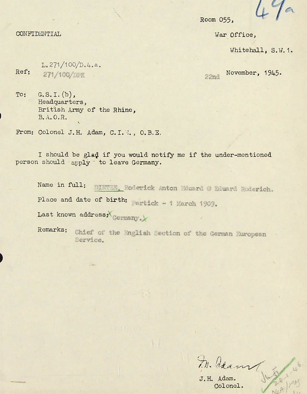 (maybe name deleted) with regard to the W.S. Form 17 attached, I have acted on the assumption that Dietze, if he come to this country, will travel on a British passport. (AOB: Dietze possessed dual nationalities: German and British; he was bi-lingual) In any event he would probably claim British nationality if he were refused leave to land. I suppose, therefore, there is no object in instruction the Ports to refuse him leave to land.