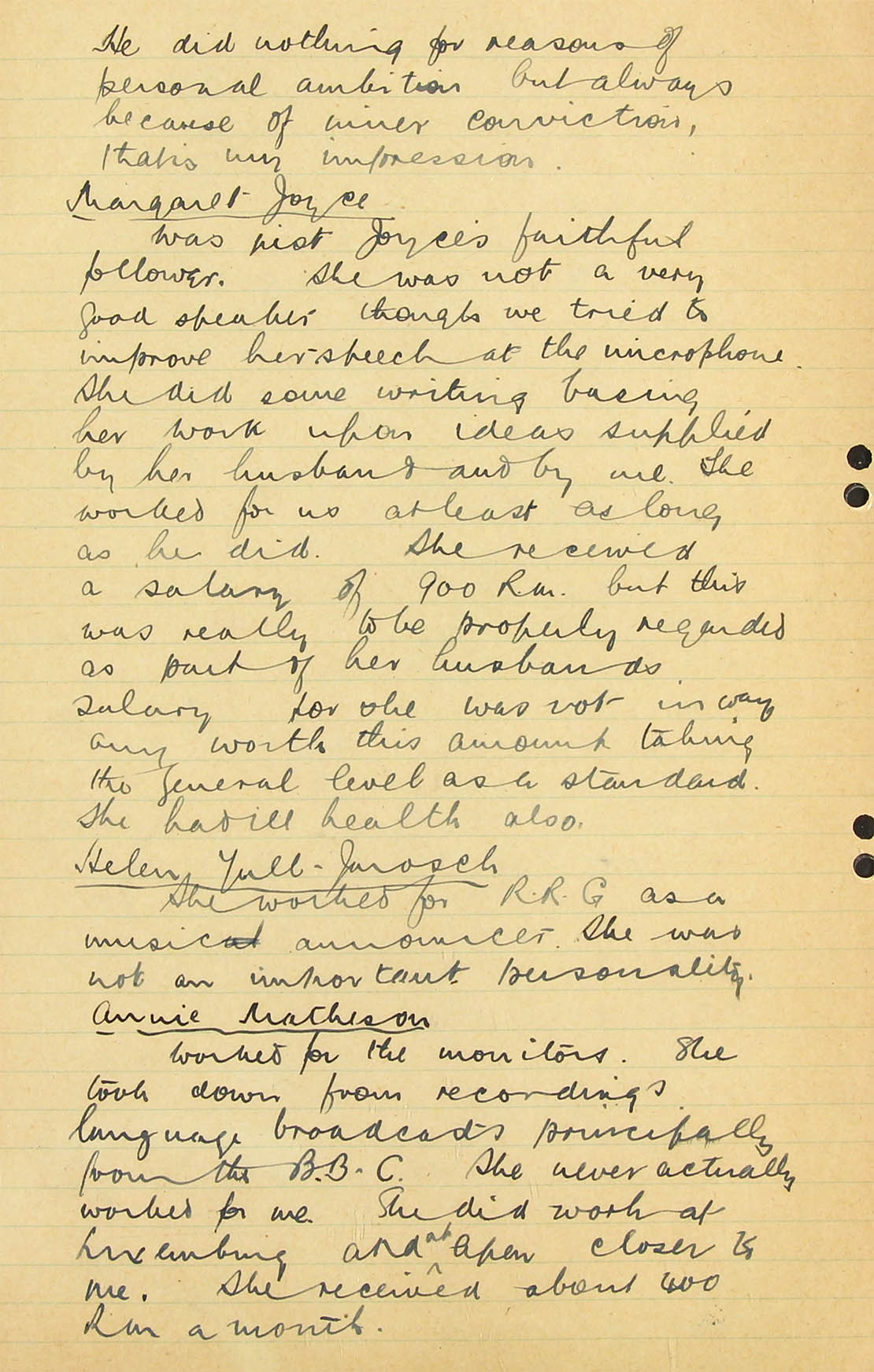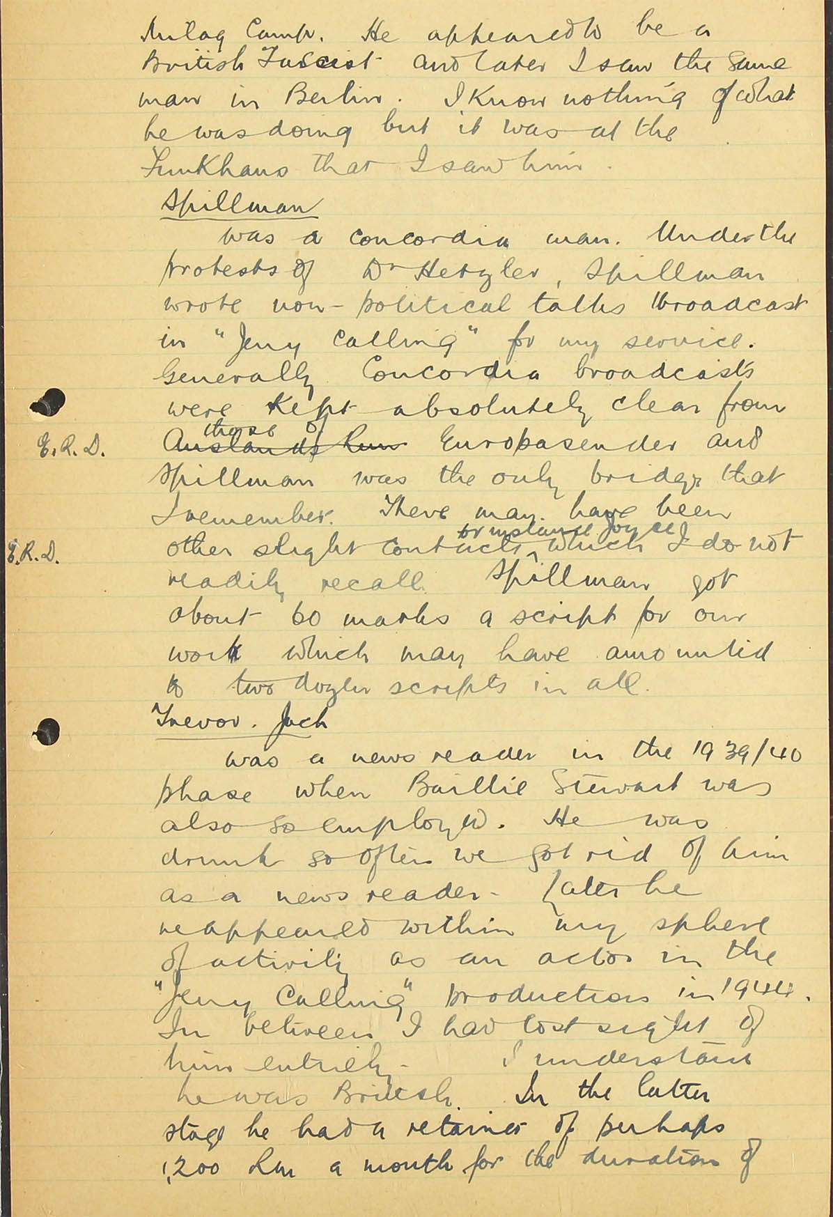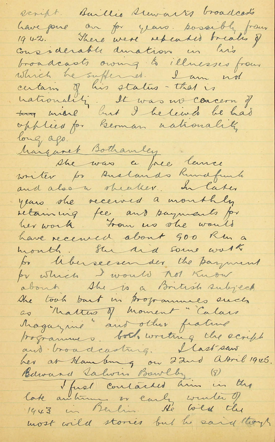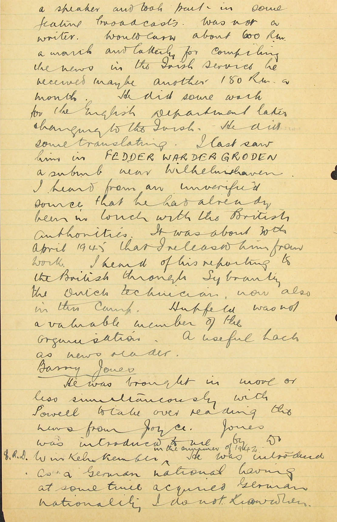 I am afraid that none of our monitors know him and therefore could not identify his voice. I personally heard him very early on in the war in a Zeesen (AOB: Auswärtiges Amt; A.A.) transmission for Africa, reading a summary in English of one of Hitler's speeches, but never heard him take part in any of the Haw-Haw broadcasts to England and I have not heard him take part in any broadcast in German, either at the beginning of the war or more recently, but I listen so infrequently that my evidence on this point is not really very valuable.