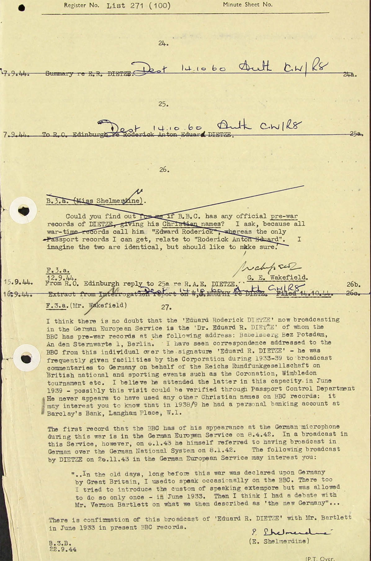 I think there is no doubt that the 'Eduard Roderick Dietze now broadcasting in the German European Service is the 'Dr. Eduard R. Dietze' of whom the BBC has pre-war records at the following address: Babelsberg Bezirk Potsdam, An den Sternwarte 1, Berlin. I have seen correspondence addressed to the BBC from this individual over the signature "Eduard R. Dietze' - he was frequently given facilities by the Corporation (BBC) during 1933-39 to broadcast commentaries to Germany on behalf of the Reichsrundfunkgesellschaft (RRG) on British national and sporting events such as the Coronation, Wimbledon tournaments etc. I believe he attended the alter in his capacity in June 1939 - possibly this visit could be verified through Passport Control department. He never appears to have used any other Christian names on BBC records: it may interest you to know that in 1938/39 he had a personal banking account at Barclay's Bank, Lagham Place, W.1.