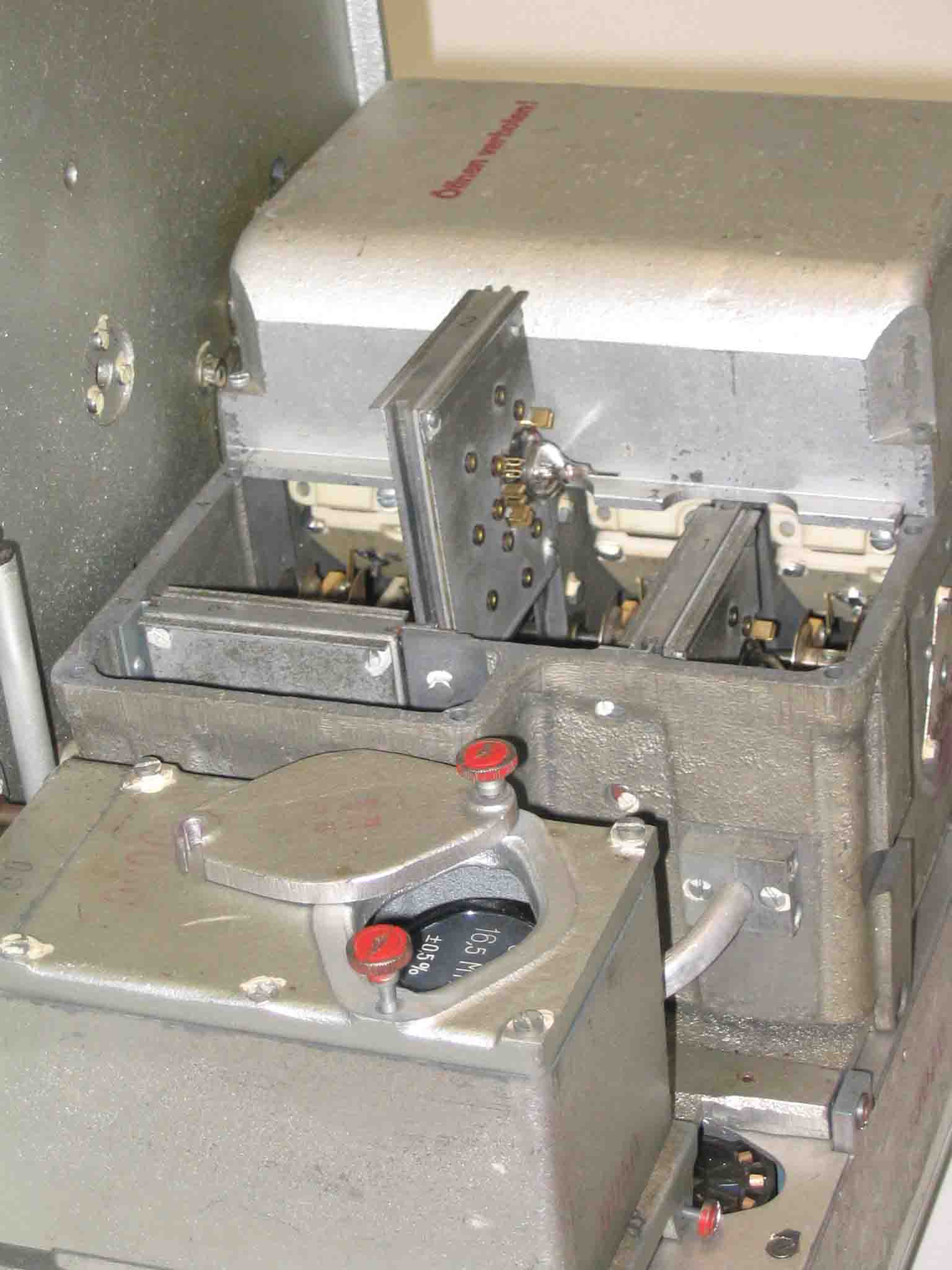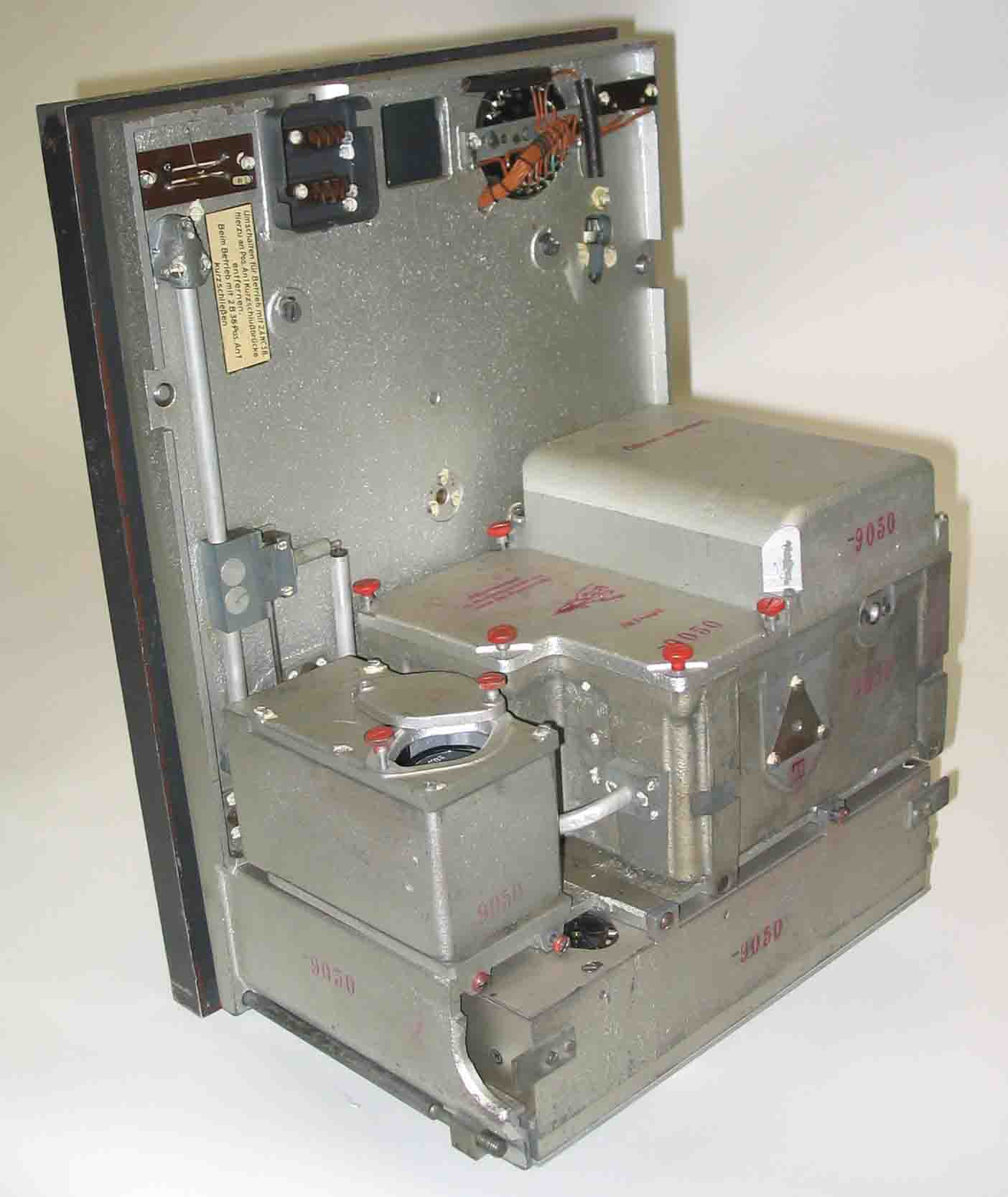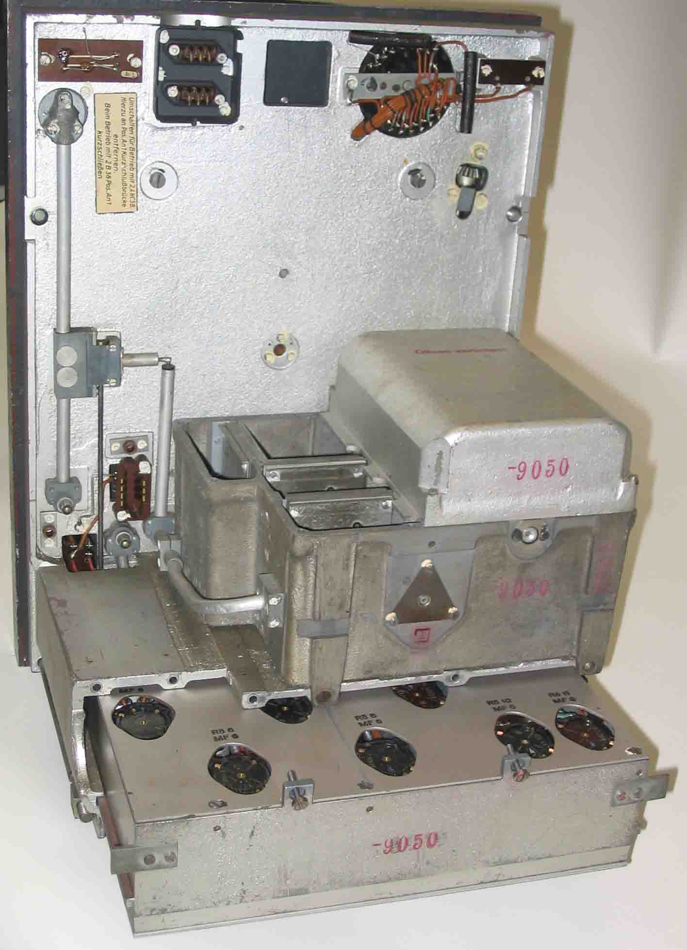 The RF (front-end) stage of this receiver has been constructed very sophisticated. The acorn valves (tubes) are mounted in a kind of plugin unit. It has several functions: so as to screen off the in and output of the (amplifier or mixer) stage. Secondly, the metal frame of the module, together with its mica dielectrics, acts as “suppressing or blocking” circuitry. The 16.5 MHz quartz cristal holder is visible through the elliptical window in front.
