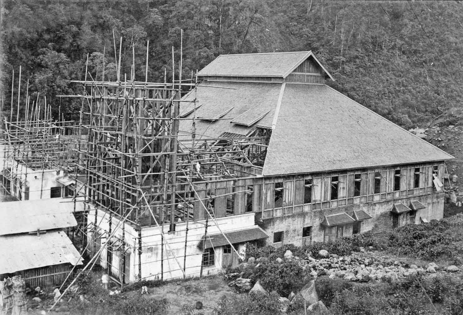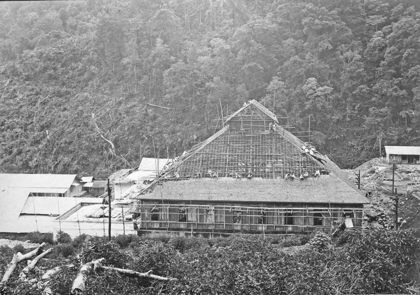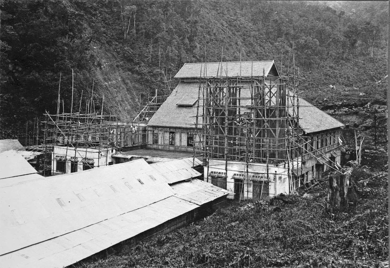 Viewing the right-hand side antenna tower under construction. Please notice also the clouds hanging in the canyon. Living and working at Malabar was often quite unpleasant for most days of the year. Particularly in the wet seasons. Klaas Dijkstra once recorded, that it was officially prohibited that, in his own living place (a few hundred metres from the station building), an electrical stove was used! Consequently, they had to cope with a cold and wet house; where drying was sometimes rather difficult. Have you ever slept in a clammy bed? Those familiar, do know what moist means!