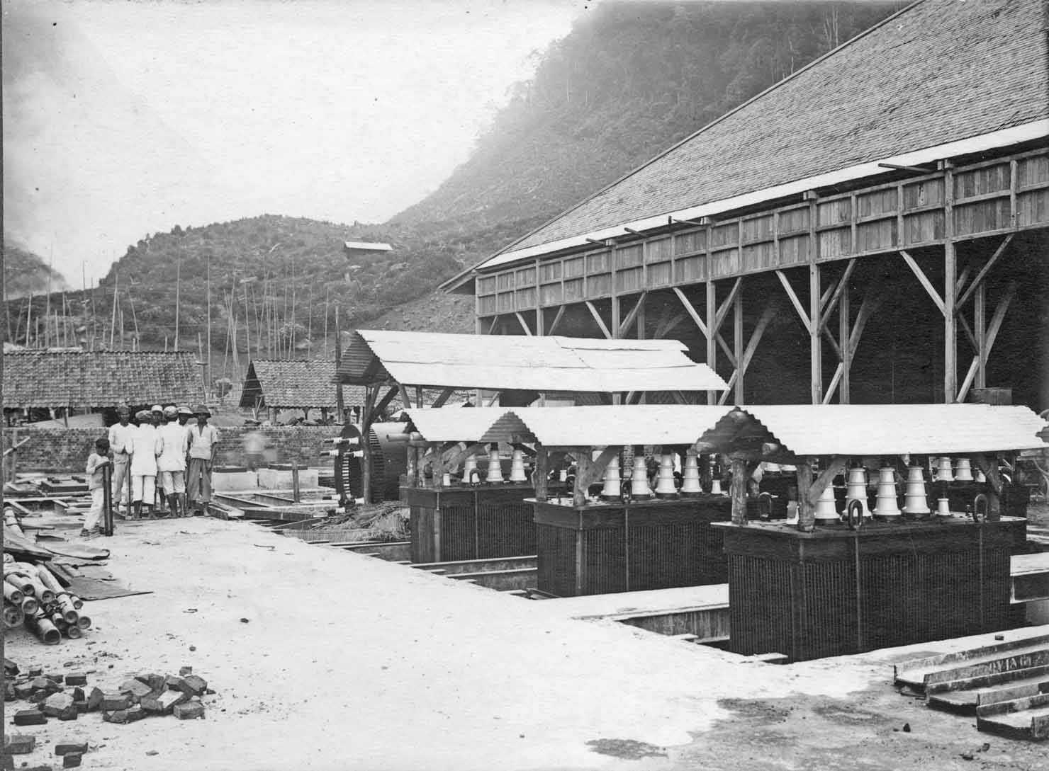 Looking from the western canyon slope towards the Bandung high-valley. Please notice the triangle pond on the left, which must have a supplementary water basin, as, from what we know, the main cooling pond was in front of the station building. Maybe, the latter had more an ecstatic function. This latter pond still existed, when we visited the site in 1994. However, there did not exist any building, but the concrete ground floor of the station building.