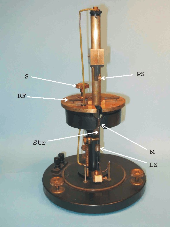 RF = The pulley sheave position can be moved up and downwards by means of RF, as to tune (adjust) the galvanometer at its appropriate resonance frequency (viz. the optimal length of the string). We may think of frequencies of 25 - 125 Hz