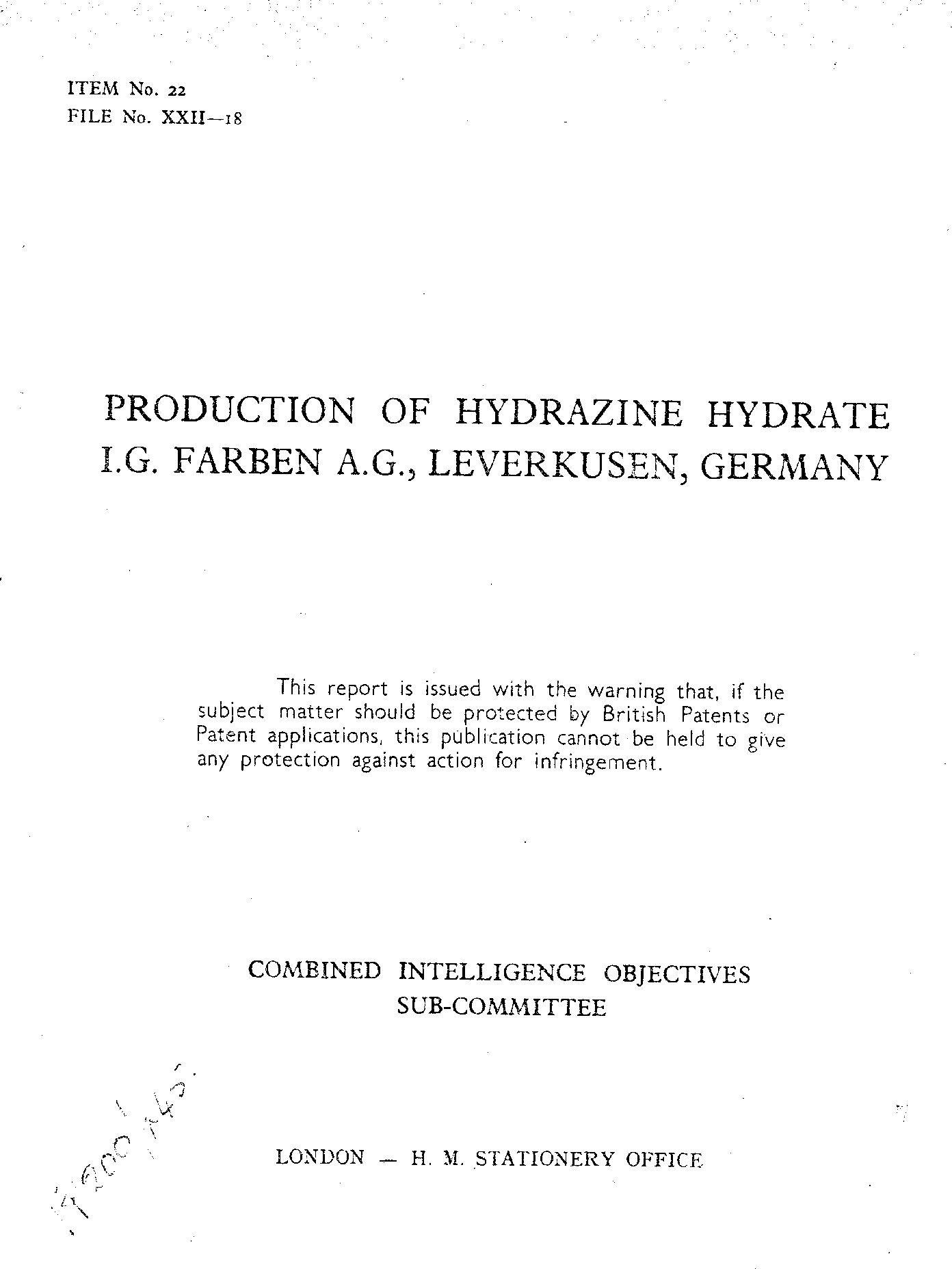 Keywords: Interviewing Drs. Klebert Konrad and Redies Directors of I.G. Farbenindustrie at Leverkusen for the manufacture of hydrazine hydrate. Production was started in April, 1944, when 20 tons were produced. This was increased to 40 to 50 tons per month and a total of 280 tons were produced in 1944. Only about 45 tons were produced in 1945.