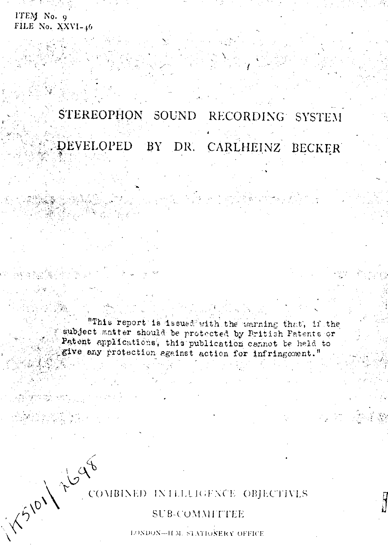 The system described here was developed by Dr. Carlheinz Becker of Thansau über Rosenheim, Germany. Dr. Becker is a capable German physicist who started development of the system in 1938. Her worked without government interference until 1942 when he was ordered to convert it to an explosion power recorder for which it is well suited in many respects. In 1944, work on the recorder was stopped and Dr. Becker was put in making high voltage regulated power supplies for laboratory use. several of these were delivered. These are excellent quality but present no advance over our own designs.