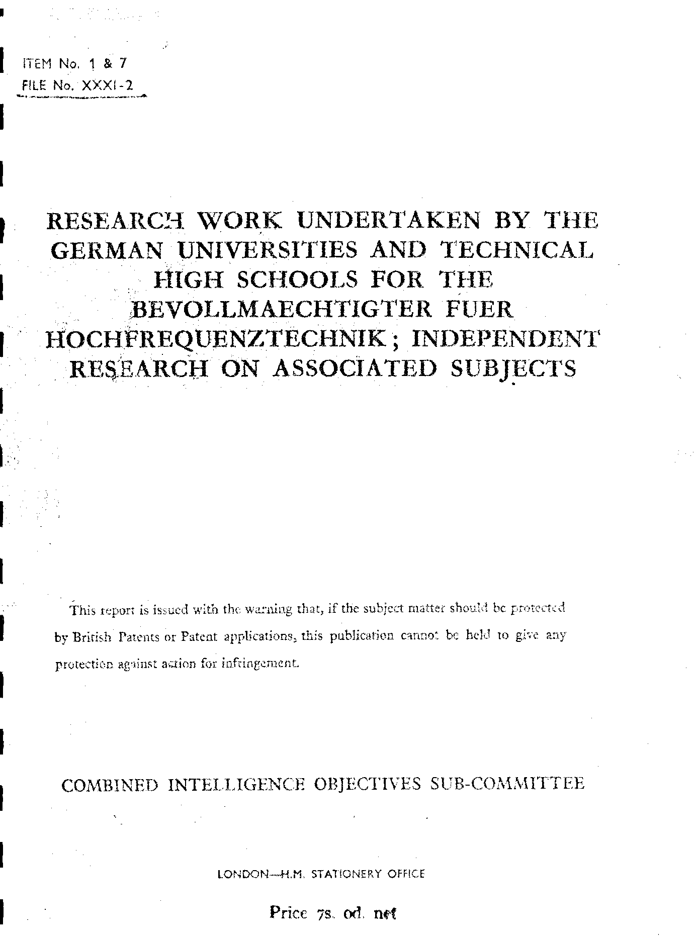 Physikalisches Institute der Universität, Erlangen 13 June 1945 (this time famous Dr. Hansell attended, AOB); Prof. Dr. Rudolph Hilsch head of Physics Institue .. Dr. Pohl of Göttingen - Dr. Gudden had worked on semi-conductors for the Heeres Waffenamt (HWa, AOB); Crystal-detector Investigations ... Dr. Konig (König?, AOB) Göttingen has an electron-microscope at his disposal, with that he showed in a recent work, that a detector-effect with a metal-point only occurs, when the crystals are larger than 10-4 cm. He could get layers in crystalline state by depositing Ge-compounds in vapour state F.E. GeC14. Ge-crystal layers of any desired shape shall grow according as the temperature of the porter-material (black-lead) is chosen. In connection to that, one student in my institute has investigated the behaviour of thin Ge-layers produced by sputtering the metal in high-vacuum. .. ; The practically used substances as Ge, Si are not proper for detecting the principles of the rectifying properties ...; Dr. Kluvius who was said to have discovered the rectifying effect of Germanium .. Dr. Welker of T.H. Munich was said to have maid the first germanium crystal detector in conjunction with F.F.O. (please see also Vandormeal's paper, in which Welker's and Dr. Schottky's engagement in early semi-conducting theory is being dealt with, AOB); Dr. Schottky now at Schloss Pretzfeld was engaged on theoretical analysis of crystal detectors; Dr. Stutzer of F.F.O. who performed high frequency tests on crystals; Prof. Gaus also did work on crystal detectorrs but had been interned in a German concentration camp. Dr. Hilsch claimed ... ; Low Temperature Physics Dr. Hilschg outstanding interest was in low temperature physics at which he claimed to be a master. He showed to us apparatus which he asserted was was superior to any to be found elsewhere in Germany .. ; superconductivity Dr. Hilsch stated ... ; In the course of his researches he discovered that CuS, although a good insulator at normal temperatures, becomes superconducting at 1.7 degs K. Although it was not his own work, he mentioned the discovery that NbN (Niobium Nitrate) had transition point at 25 degs. K, which is far above the normal range of transition points. Sidelight on Initial Attitude of Nazi Government to Scientists. ... Interrogation of many German scientists indicates that the Nazi Government initially failed to appreciate the importance of physics and their work. ...