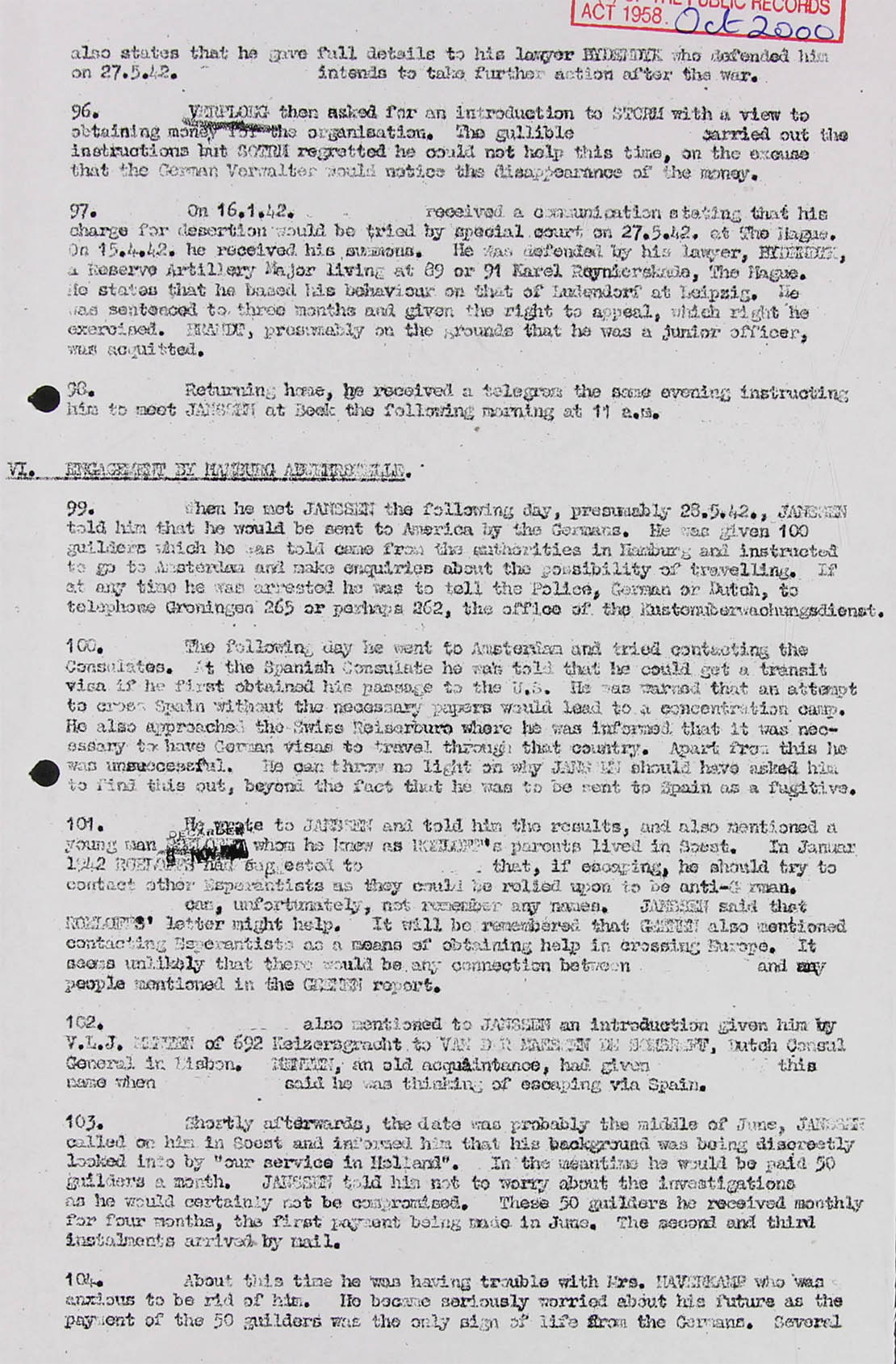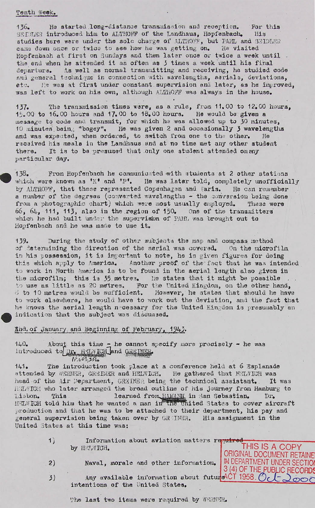 261. He is incapable of concentration and his mental processes are very far from agile. His complete lack of discretion has been amply evidenced and he suggested in all seriousness that, if he were sent to the U.S.A., he would tell his friends, such as Nysenhoff?, about his experiences in Hamburg. That he could be controlled would have to be a continuous 24 hour watch.