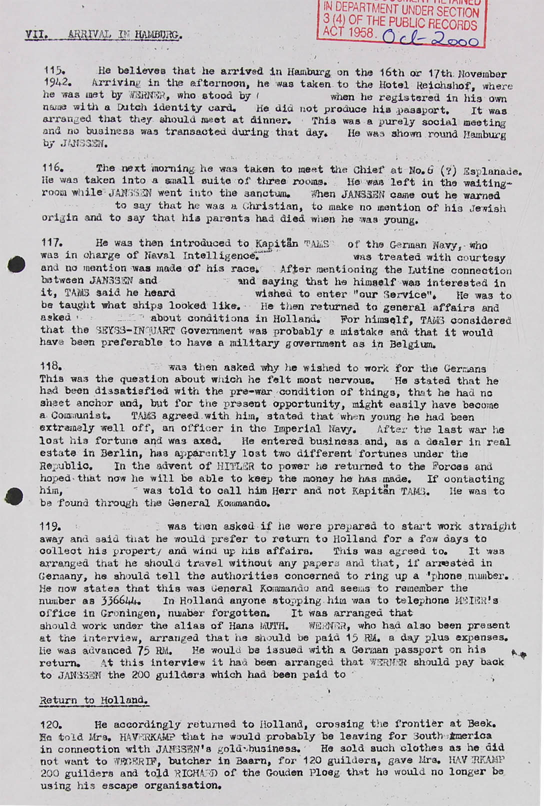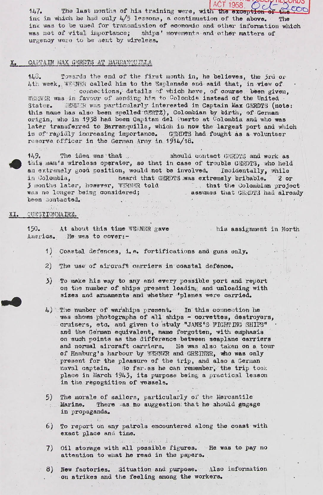 Mr. Goldschmidt's espionage mission at last got under way in August 1942 when Janssen told him he was to go to South America for economic espionage. Janssen took him to Hamburg, where he was in contact with a certain Werner and a Captain Tams (Thamm) (probably an alias) of naval (Marine) espionage section (I M). He received the following instructions in Hamburg: