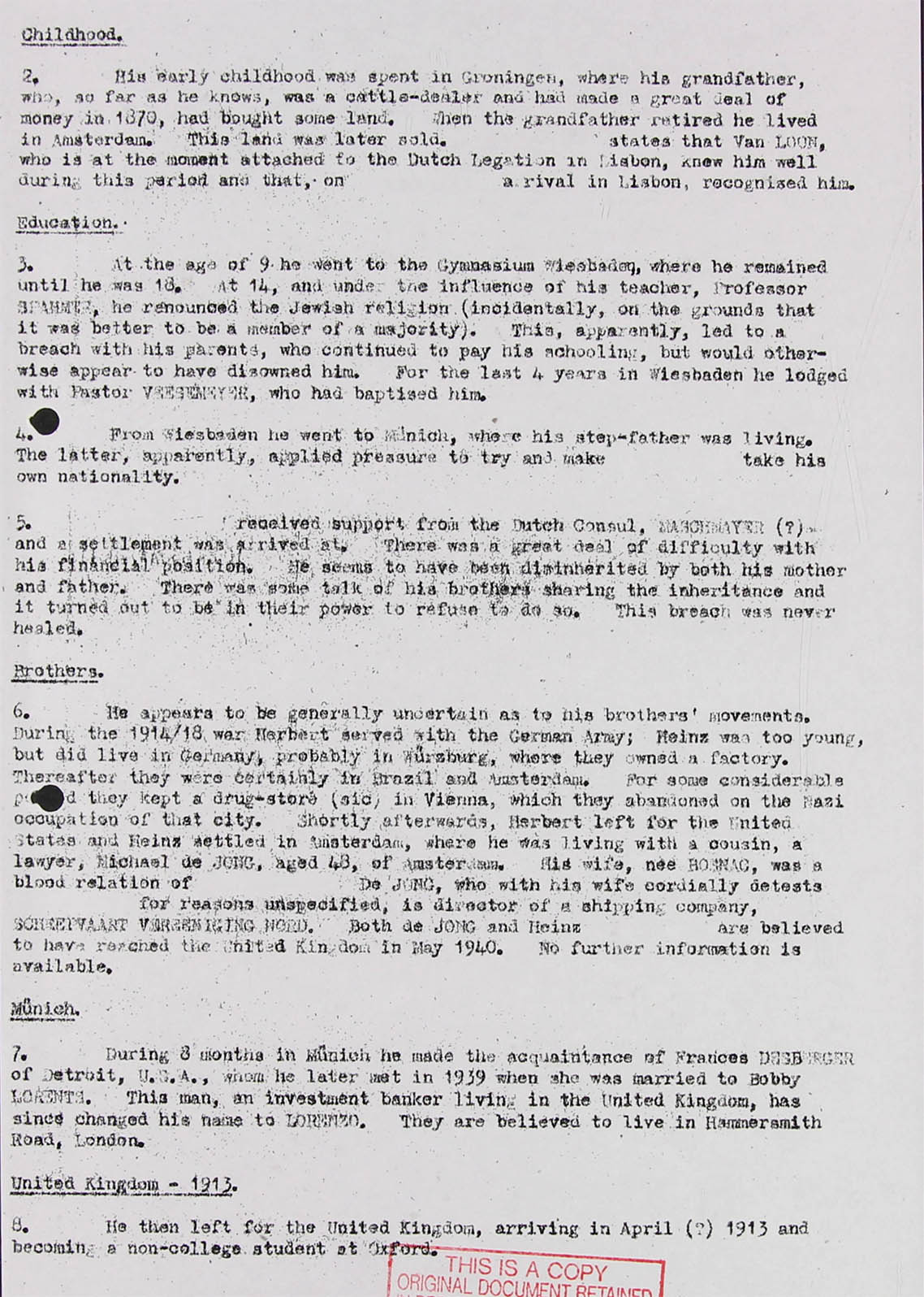 260. A worthless individual, the crumbling of some character can be traced from 1920 onwards. He has the lack of self-respect which constitutes a good borrower of money, but a certain charm of man??r and more than superficial frankness which have helped him to make friends with such ease. he is essentially a realist with no delusions about himself, which makes him behave naturally with all c???es and people and renders him readily adaptable. He would not appear to be tied by nationality, religion, ideals or class. His lack of self-respect was evidenced during interrogation by an almost masochistic pleasure in confession of such irrelevant details on? that at one? period during his life he had been free outside which he admits is an all-important one, the opinion of the majority and of whose impartial judgement of himself obtrudes on his consciousness. While no person or ideal has had any lasting away, he is because of his character and because of his instability, eminently an enable to influence from those about him.