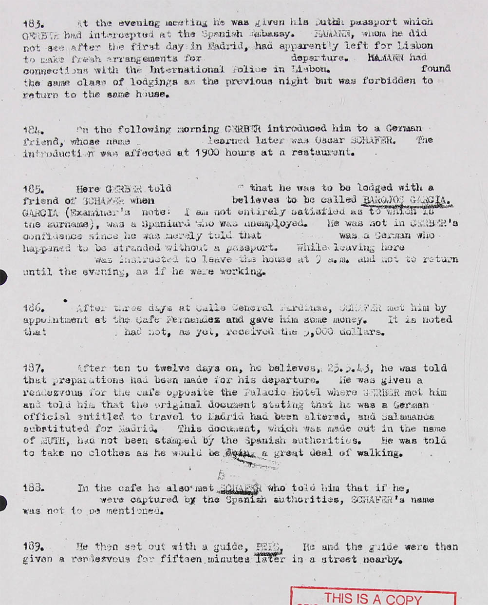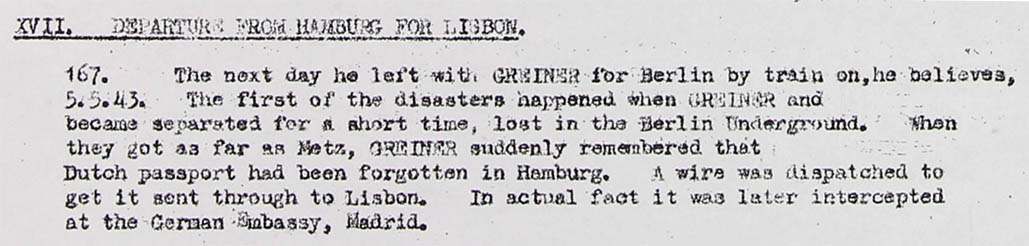 Meanwhile there were visa difficulties: a Spanish visa proved unobtainable without the South American - which Mr. Goldschmidt hoped to obtain through the Dutch Consul-General in Lisbon to whom he had certain Esperantist introduction. After his training was completed therefore arrangements were made for crossing the Portuguese frontier clandestinely. He went with a certain Greiner to Hendaye (Border town in South/Western France opposite the Spanish town Irun) , where Greiner had some trouble at the frontier with the German police over the money he was carrying (wasn't this in the vicinity of Paris?): this had to be cleared up at Paris, and Mr. Goldschmidt went on by car to San Sebastian. Here he met two Germans Gerber and Hamann. Hamann, it seems probable, is the I TLWi agent. F.W Hamann, already known to us. One attempt to cross the Portuguese frontier failed and Mr. Goldschmidt returned to Madrid where he had great trouble with his accommodation and was more or less left at large for about three weeks. On 25th May he left Madrid with Gerber and a Spanish guide, crossed the frontier near Villa Formosa, caught the night train from Guarda to Lisbon, where he arrived on 27th May. He was taken in Lisbon to Rua do Garmo 98 where a German gave him 5000 dollars and instructions. He then the same day called on the Dutch Consul-General and gave him the whole story.