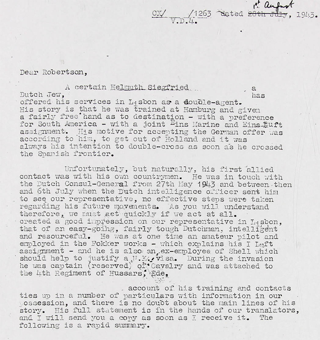 A certain Helmut Siegfried Goldschmidt a Dutch Jew, Mr. Goldschmidt has offered his services in Lisbon as a double-agent. His story is that he was trained at Hamburg and given a fairly free hand as to destination - with a preference for South America - with a joint Eins Marine (I M) and Eins Luft (I L) (I = military intelligence, L = GAF) assignment. His motive for accepting the German offer was according to him, to get out off Holland and it was always his intention to double-cross as soon as he crossed the Spanish frontier.