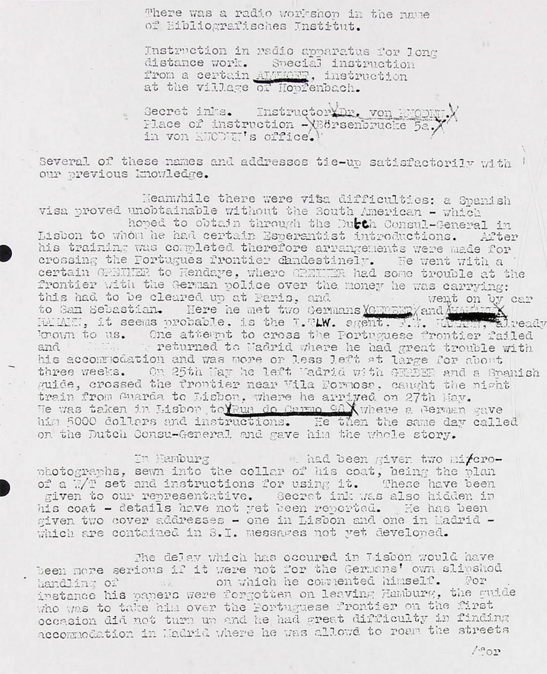 In Hamburg Mr. Goldschmidt had been given two microphotographs, sewn into the collar of his coat, being the plan of a W/T set and instructions for using it, These have been given to our representative. Secret ink was also hidden in his coat - details have not yet been reported. He has been given two cover addresses - one in Lisbon and one in Madrid - which are contained in S.I. (Secret Intelligence) messages not yet developed.