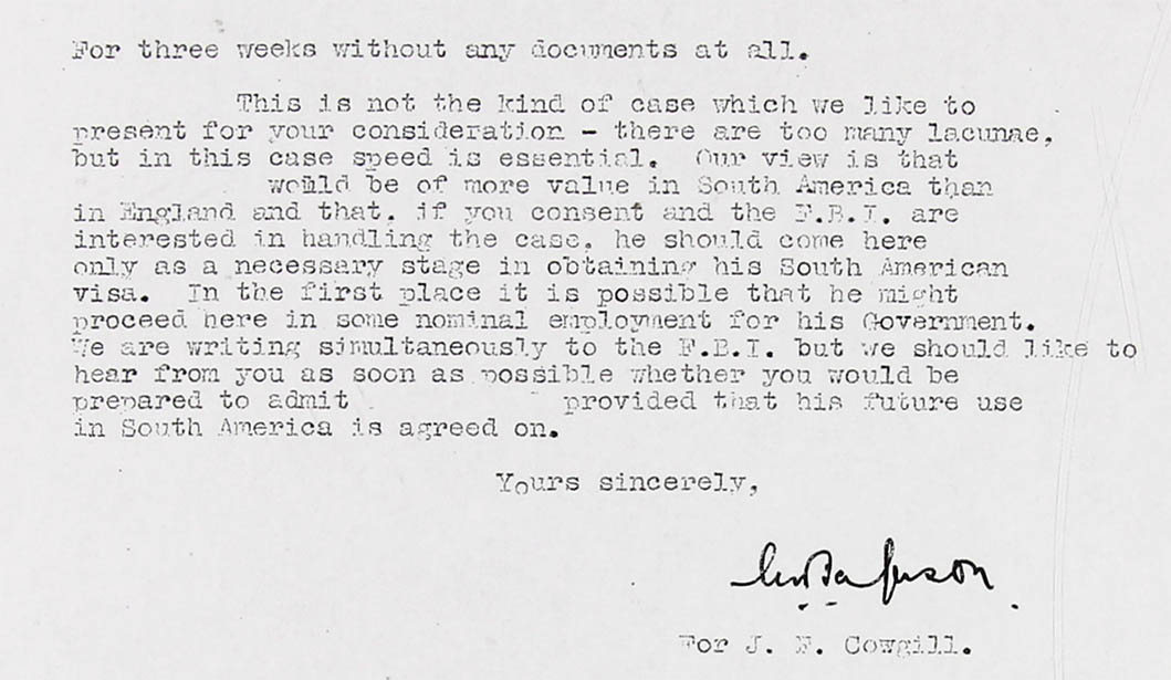 This is not the kind of case which we like to present for your consideration - there are too many lacunae, but in this case speed is essential. Our view is that Mr. Goldschmidt would be for more value in South America than in England and that, if you consent and the F.B.I. are interested in handling the case, he should come here only as a necessary stage in obtaining his South American visa. In the first place it is possible that he might proceed here some nominal employment for his Government (which one?). We are writing simultaneously to the F.B.I. but we (S.I.S./M.I.6 and M.I.5) should like to hear from you as soon as possible whether you would be prepared to admit Mr. Goldschmidt provided that his future use in South America is agreed on.