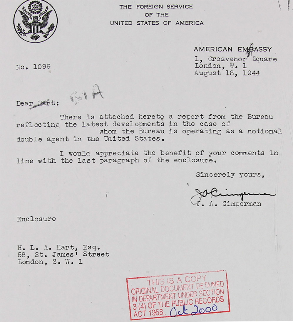 Goldschmidt a Dutchman, was recruited in Holland as a German agent in the summer of 1942 and received training in W/T and secret writing. He arrived in Lisbon (AOB: The place, with sound transport connections with the U.K. and the place to arrange visas as to enter Great Britain) in May, 1943, and there contacted the Dutch authorities under whose, and later S.I.S.'s (M.I.6) instructions he subsequently acted. He arrived in England on 14.9.43 en route for America, where he was intended to work to work, it having been arranged with the F.B.I. that he should first come here (London) for the purpose of being fully interrogated. As a result of this interrogation the F.B.I. decided that Mr. Goldschmidt was personally too irresponsible and troublesome to be allowed to proceed to America and they therefore proposed that he should actually remain in this country (England) but that letters in secret writing purporting to have been written by him in America should be despatched under their auspices. To this procedure Mr. Goldschmidt agreed and accordingly he is now in this country while letters in his name are being sent to the Germans from America.