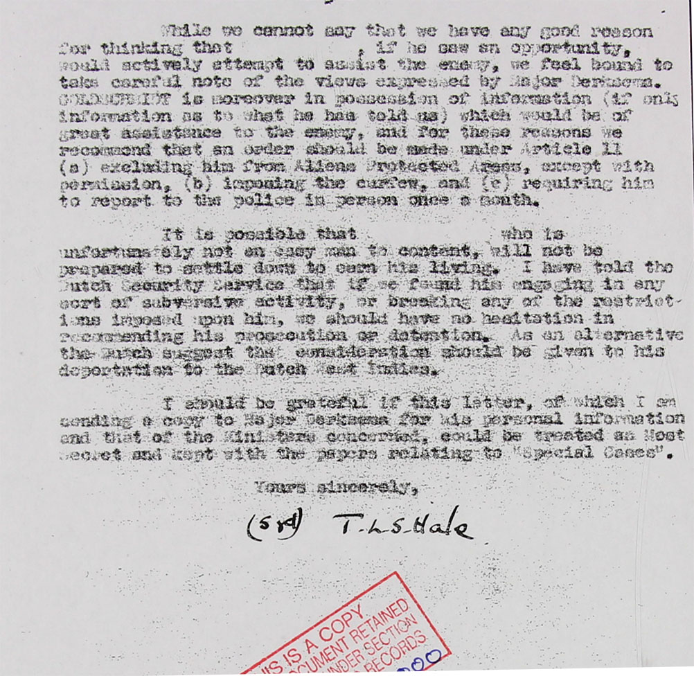 Meanwhile, in order that there shall be no complications with the Dutch government in London, we have asked our Dutch section to see the Dutch Intelligence authorities and give them a short outline of the case on the lines of the attached not.