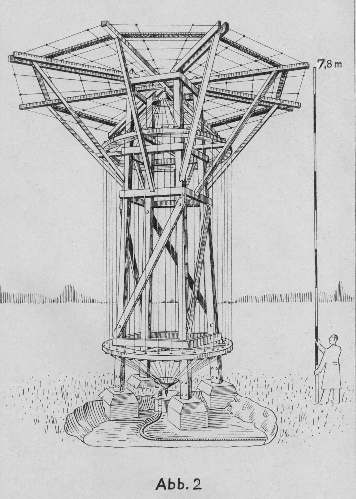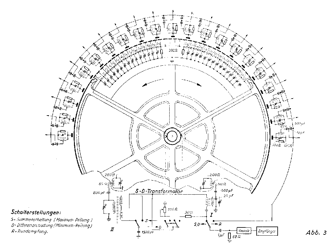 This line drawing shows the complexity of the so-called Compensator-principle. Each outside pointer is being connected onto a separate wide-band vertical aerial (antenna) of special construction